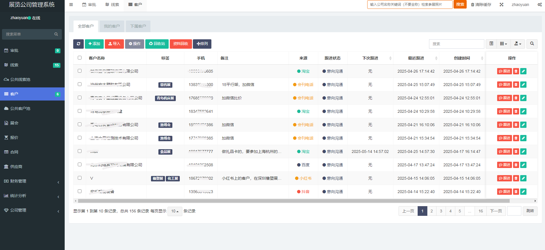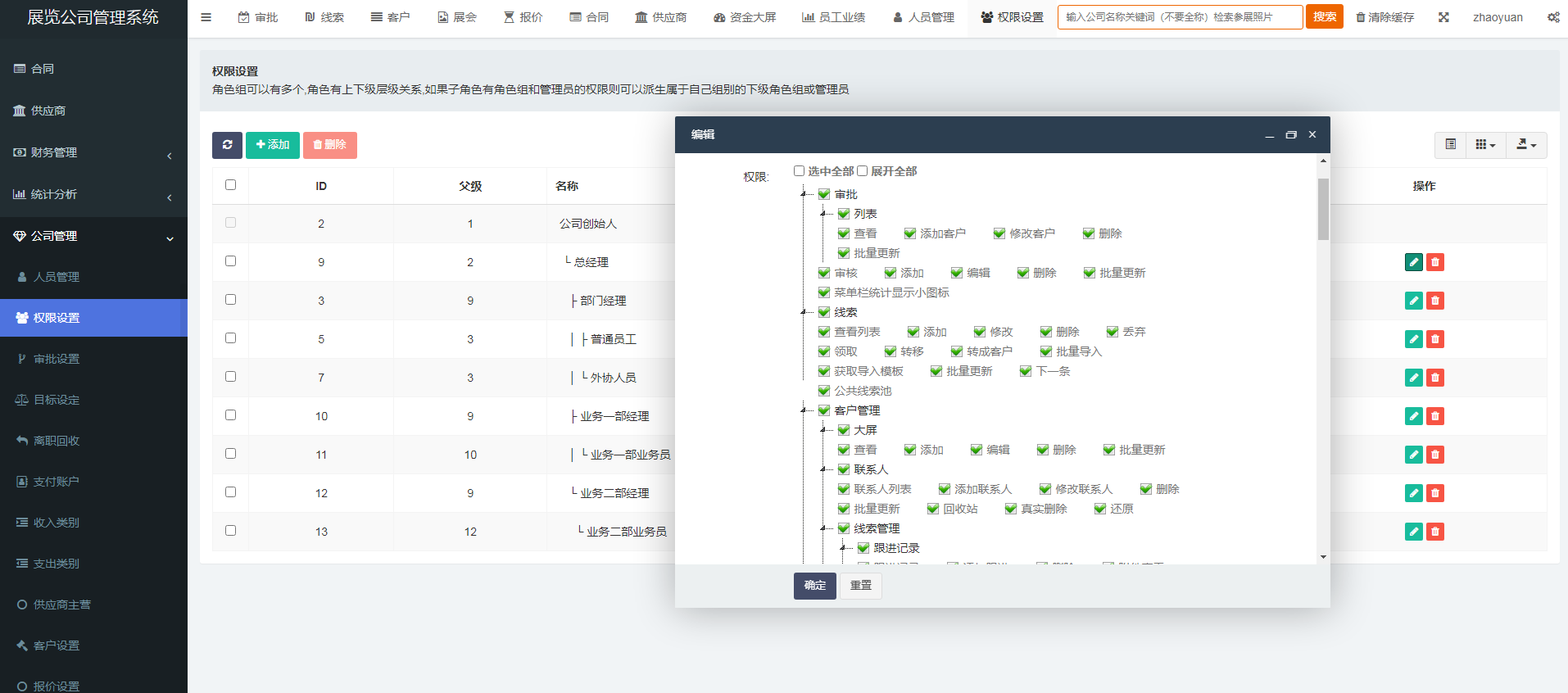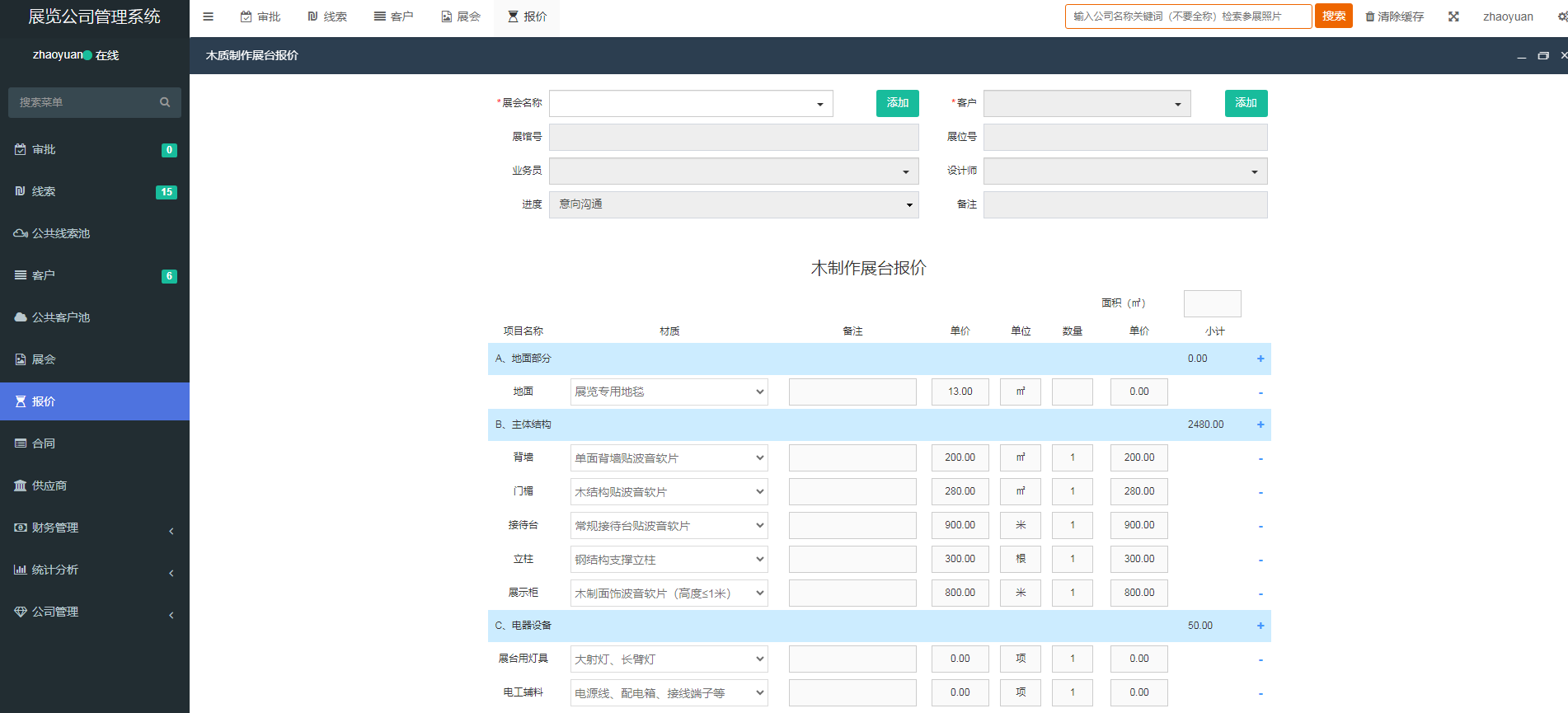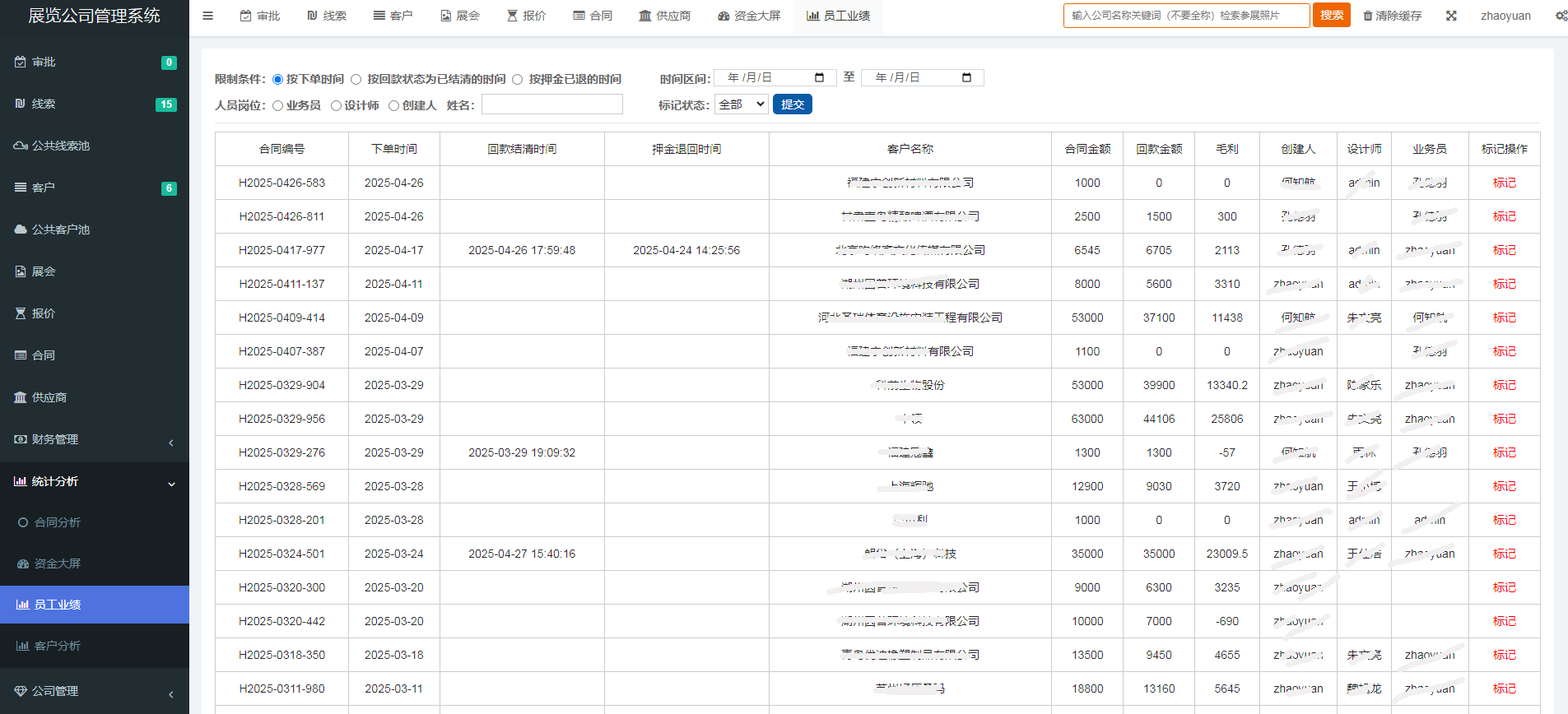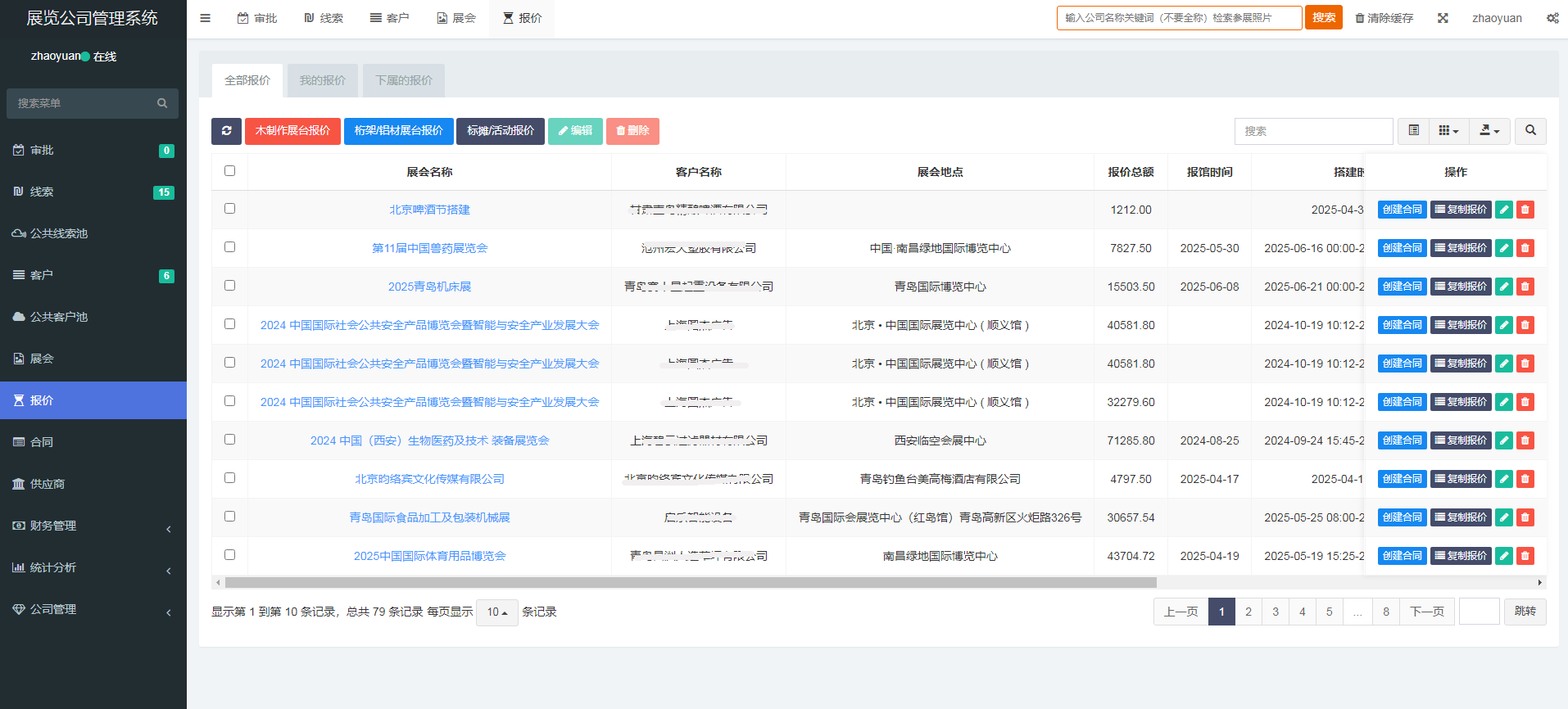 展览公司管理系统(功能包括:客户精细化管理、在线快速报价,记账系统、合同管理,项目管理,统计分析,押金管理,供应商管理等),是基于展览公司实际工作需求来定制开发的,可以大幅提升工作效率,同时所有工作留痕,形成公司无形资产。方便展览公司培训业务人员、对业务人员进行权限设置和绩效管理,真正实现数字化经营。